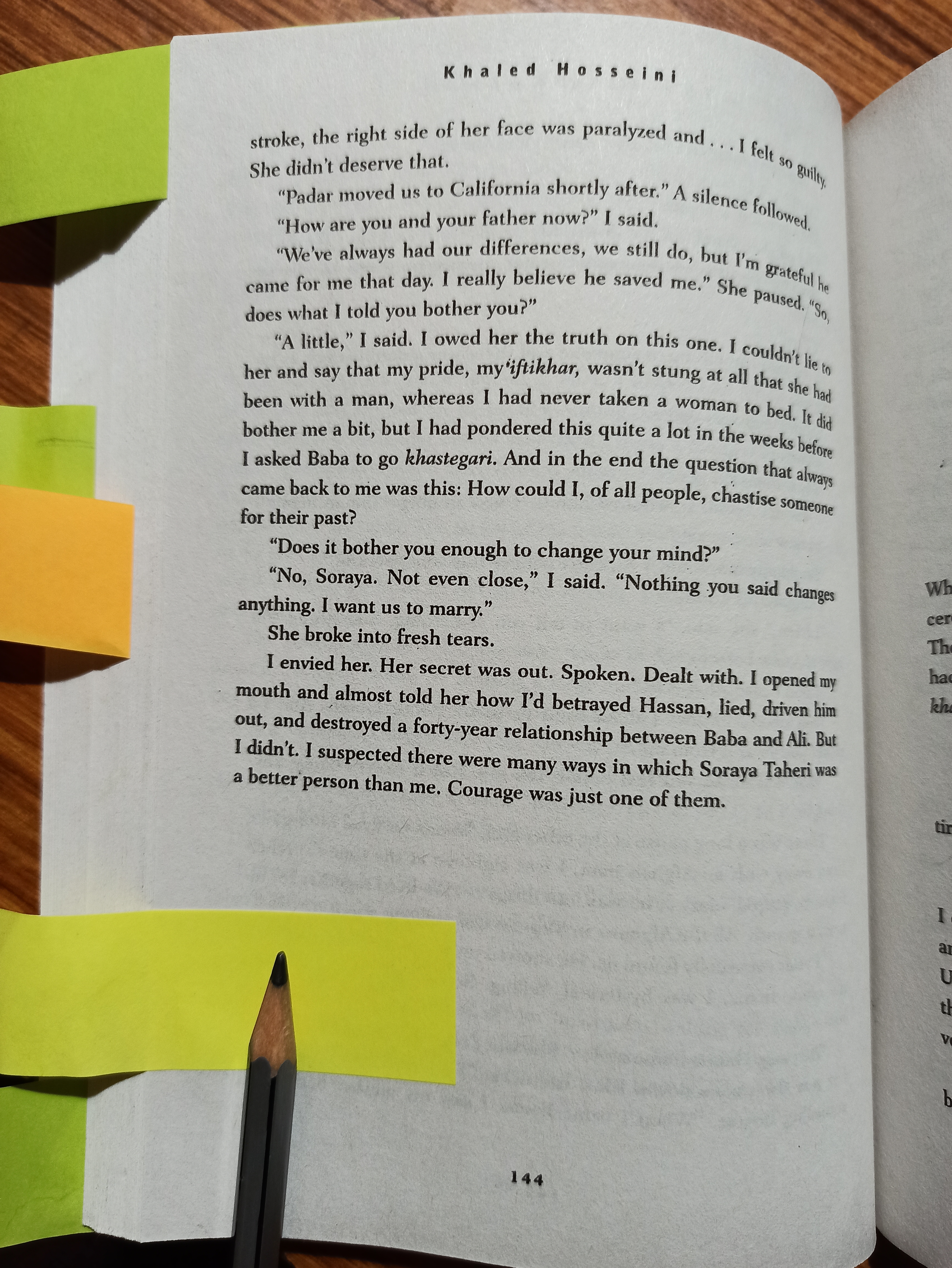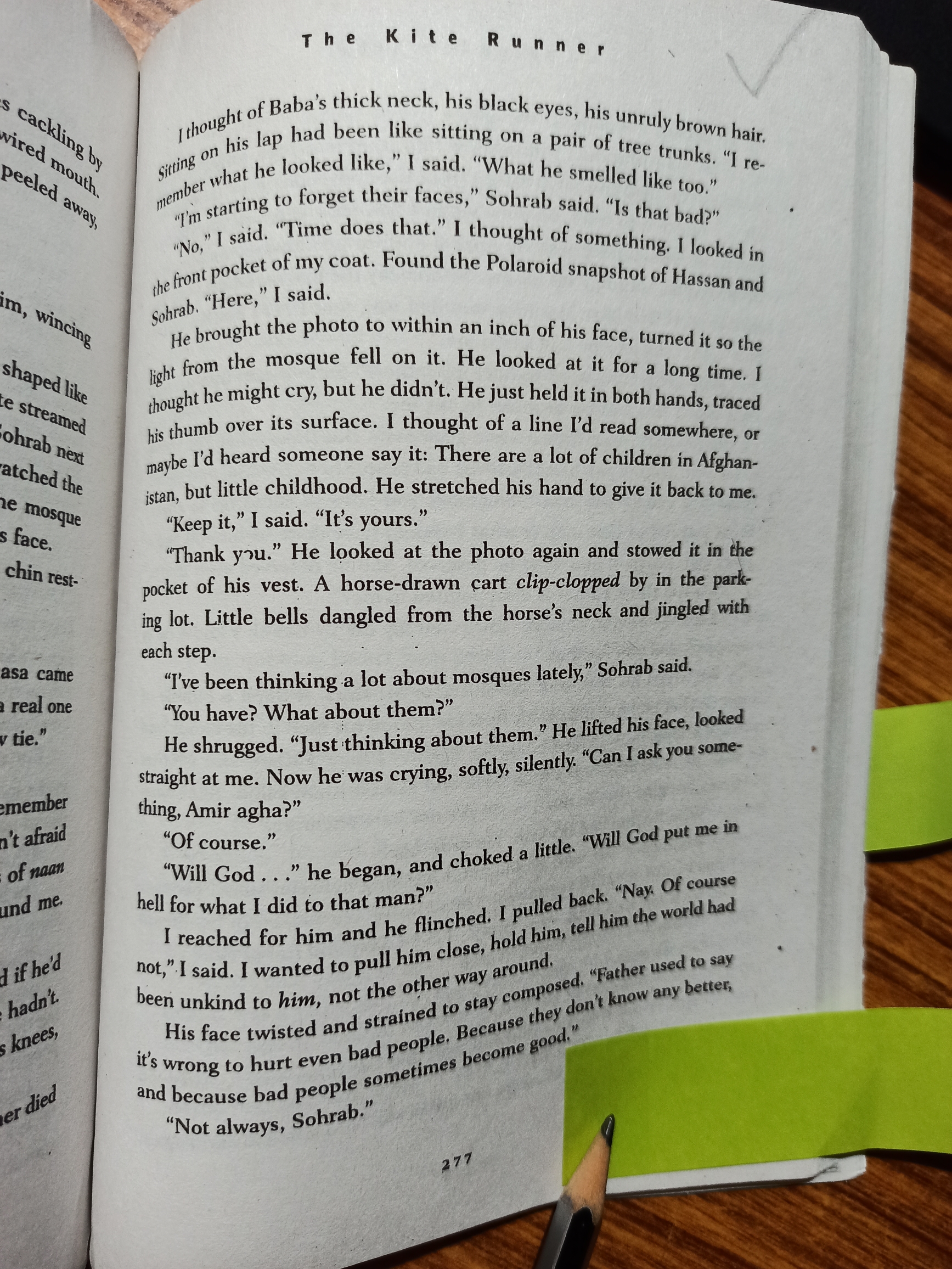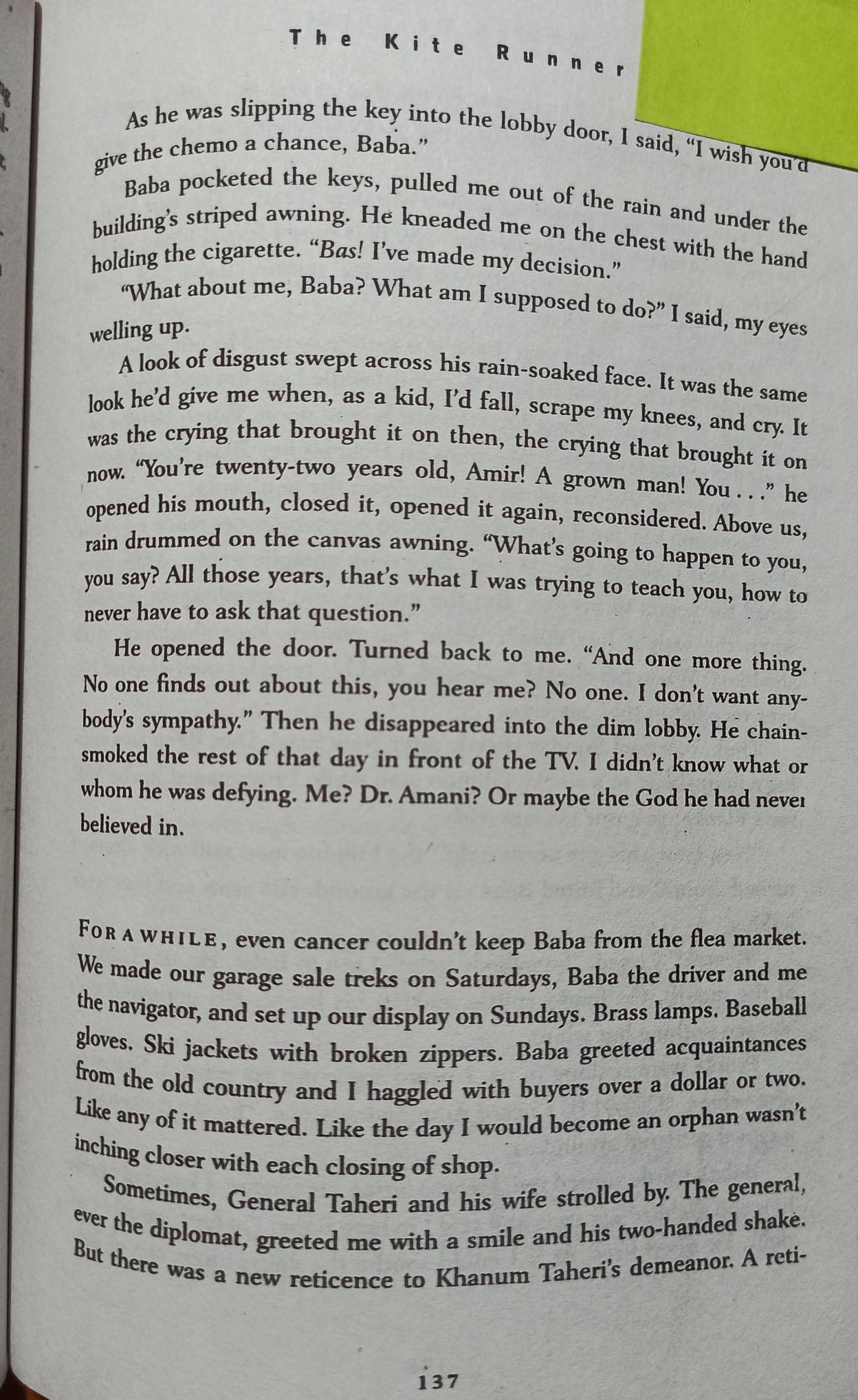 The story has a lot of twists and turns, which keep the reader’s feet off the ground. One of them is returning of Hassan’s mother, Sanauber. She had eloped after Hassan was born, because he had a scarred face like his father, Ali. Sanauber blamed Ali for everything bad. But she returns after 23 years as a old lady, with beaten up face. Other twist comes, when Rahim Khan, Baba’s old friend reveals a big secret to Amir long after Baba’s death, which is that Hassan and Amir were half brothers, and that answers Amir’s long held question, why would Baba care about Hassan so much??